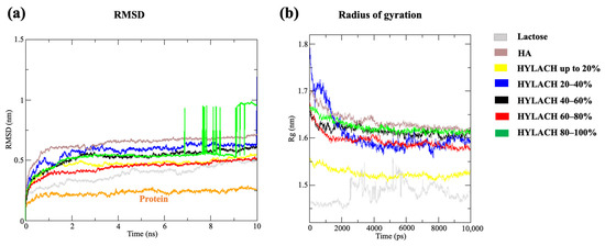 RMSD and Radius of gyration results. (a) The protein-associated RMSD curve is highlighted in orange and represents the most stable and equilibrated system, with an RMSD of 1.5 Å. Lactose, HYLACH of up to 20%, and HYLACH from 60 to 80% lactosylation were the systems that most closely resembled the unbound protein’s configuration. Rather, the system formed by Gal-3 and HA differed the most from the protein’s configuration. (b) The most structurally stable and compact system was the one containing lactose, even though the trend of the radius of gyration is not linear. Next, the most stable systems were Gal-3 and HYLACH of up to 20% and HYLACH of 20 to 40% lactosylation. The least compact was the protein–HA system with a radius of gyration of about 1.65 nm.