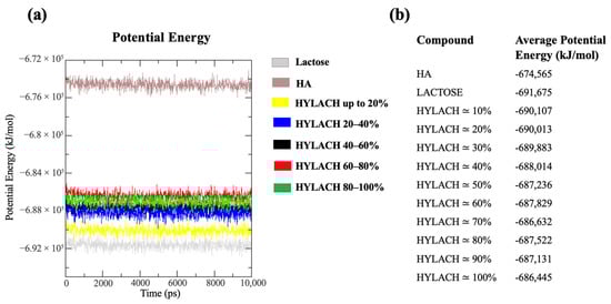 HYLACH compounds and lactose have lower potential energy and binding free energy than HA. The total potential energy was calculated by summing the contributions of Lennard–Jones, Coulomb, and the bonded terms. The analysis of potential energy shows that lactose had the lowest energy values, with an average potential energy value of −691,675 kJ/mol (Figure 2). The class of ligands with very low potential energy is represented by HYLACH of up to 20% and HYLACH of 30% lactosylation. HA had the highest potential energy; hence the protein–ligand complex is the most unstable from an energy perspective, with an average potential energy value of −674,565 kJ/mol. The average potential energy of each HYLACH compound considered is listed in the table (Figure 2b).