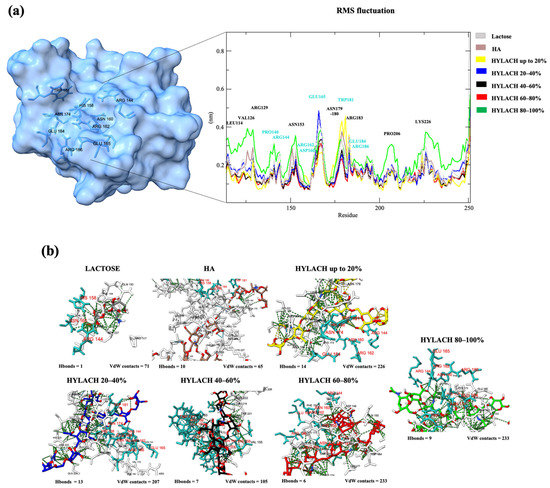 HYLACHs insert into the active site of Gal-3. The binding site of Gal-3 includes nine amino acids: TRP181, HIS158, ARG144, ASN160, ARG162, GLU165, ARG186, GLU184, and ASN174 [33]. The root mean square shows fluctuations at several amino acid levels, indicating an interaction between Gal-3 amino acids and the ligands. These fluctuations involve the residues associated with the CRD (Figure 3a), indicating that HA, HYLACH compounds, and lactose insert at the active binding site. Furthermore, it should be noted that mainly the molecule HYLACH up to 20% of lactosylation binds TRP 181 with an intense peak of fluctuation. The systems formed by Gal-3 and the following ligands produce the greater number of Van der Waals contacts: HYLACH up to 20% of lactosylation with 226 contacts, HYLACH 20–40% with 207 contacts, HYLACH between 60% and 100% with an average of 233 interactions. Regarding hydrogen interactions, both intra- and intermolecular interactions were considered. The better outcomes were as follows: HYLACH up to 20% and HYLACH 20–40% lactosylation with, respectively, an average of 14 and 13 hydrogen interactions. Lactose and HYLACH molecules fit perfectly into the carbohydrate-binding site, as shown in Figure 3b, while HA is orientated differently in the active site.