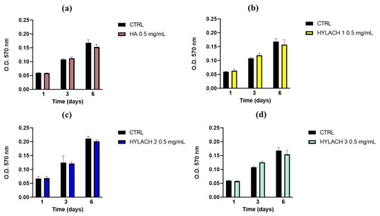 In Figure 4, typical results relative to the viability of primary human bronchial fibroblasts cultivated in the presence of 0.5 mg/mL HA and HYLACH are reported. None of the tested molecules affected cell proliferation after 1, 3, and 6 days of treatment.