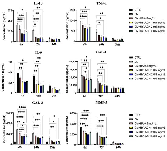The ELISA assays (Figure 6) confirmed that the CM of activated U937 human monocytes caused an increased protein expression of IL-1β, TNF-α, IL-6, Gal-1, Gal-3, and MMP-3 in cell cultures at 24 h after exposure. However, the supplementation of HA and HYLACH to the cell culture medium induced a significant downregulation of proinflammatory cytokine expression at the same time point after treatment, confirming the results obtained at the mRNA level. In fact, the downregulation of Gal-3 and MMP-3 was not only particularly marked (p < 0.0001) in the presence of HYLACH 2 but also significantly lower than that obtained in the presence of HA (p < 0.05). However, the decrease in Gal-3 expression induced by HYLACH 1 and HYLACH 2 was significantly higher (p < 0.0001) compared to the effect induced by HA (p < 0.001 and p < 0.05, respectively).
