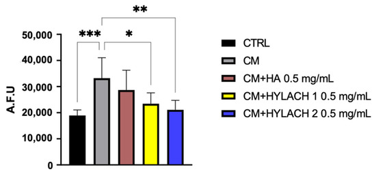 - Detection of intracellular ROS generation. Human bronchial fibroblasts were seeded in 96-well plates with a density of 10,000 cells/well, allowed to adhere overnight, and then, exposed to activated U937 CM to induce intracellular ROS generation. Cells were then cultivated in the presence or absence of HA or HYLACH for 4 h. Subsequently, the medium was removed, the cells were rinsed twice with PBS and then loaded with 5 µM 2′,7′-dichlorodihydrofluorescein diacetate (H2DCFDA; Molecular Probes, ThermoFisher, Waltham, MA, USA) diluted in PBS for 1 h at 37 °C. H2DCFDA is a nonfluorescent probe that, in the presence of intracellular ROS, rapidly oxidizes to the fluorescent 2′,7′-dichlorofluorescein. The cells were washed three times with PBS before measuring fluorescence intensity with a microtiter plate reader (Infinite 2000, Tecan, Milan, Italy) at 485 and 535 nm for excitation and emission, respectively.