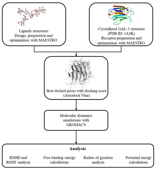 Computational simulations and in silico experimentation could be used to test the ability of molecules based on HA to interact with Gal-3, thus reducing the number of lead macromolecules. Indeed, the most promising target molecules are selected using molecular docking and molecular dynamics simulations. Computational modeling can screen the ligand that will presumably bind better to the target protein [19].