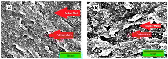 A cross-sectional scanning electron microscopy (SEM) image shows the SEBS matrix and the carbon black particles. In Figure 1, the dark grey colour represents the SEBS polymer matrix, and the white dot particles represent the carbon black nanofiller. The solution-processing method of nanocomposite preparation is evident from the SEM micro-graphs. The discontinuity of the SEBS matrix can be observed in the white, granular fillers sitting on the matrix. The SEM images of the sample also depict that the filler, carbon black, was dispersed well, with some minor agglomerates. The spherical carbon black particles are spread with a homogeneous filler distribution and are incorporated into the SEBS matrix, showing a good filler–matrix interaction. This compatibility is evident from the conductivity achieved on the nanocomposite sample.