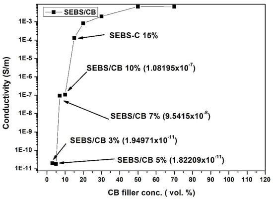 In Figure 2, which represents the percolation of the SEBS/CB vs. the conductivity samples, it can be seen that SEBS/CB 3% and the SEBS/CB 5% values are in the same exponential order. This is reflected in the graph. This can be attributed to the fact that the carbon black had just begun to percolate into the matrix. These two points display the starting or initialisation of conductivity in the matrix. The SEBS/CB 7% and SEBS/CB 10% values represent the increase in the conductivity of the nanocomposite with the increase in the amount of the carbon black conductive filler. As we observe the increase in the CB concentration, we can see a gradual increase in the conductivity.