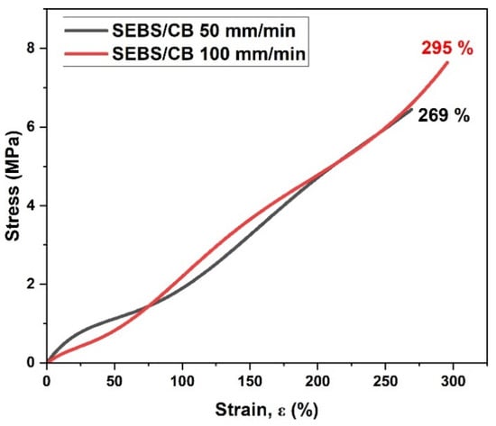 A mechanical test in the form of the stress vs. strain relationship was conducted on the SEBS/CB 15% sample at two different elongation rates: 50 mm/min and 100 mm/min. As can be seen from Figure 3, at the 50 mm/min elongation rate, the elongation at break was approximately 262%. The elongation at break was approximately 300% for the 100 mm/min rate. The graph clearly demonstrates the highly stretchable property of the piezoresistive sensor at different elongation rates. This characteristic can find practical applications in wearable electrical and medical devices.