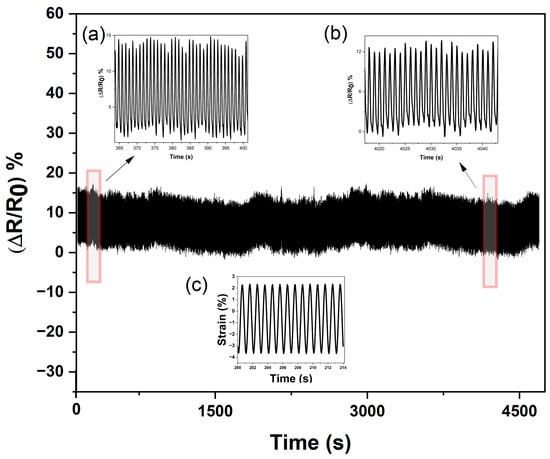 Durability and endurance test of the SEBS/CB 15% sensor. Insets (a,b) are the enlarged cyclic loading–unloading response, and (c) is the mechanical stimuli with respect to the electromechanical response.
