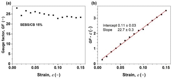 (a) Gauge factor vs. elongation of styrene-b-(ethylene-co-butylenes)-b-styrene triblock copolymer filled with 15 wt.% of carbon black (CB); (b) analysis of the resistivity change responsible for the piezoresistive effect. The red line represents a linear fit to the experimental data.