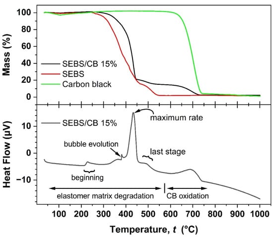 TGA analysis of SEBS, carbon black, and SEBS/CB 15% samples (upper graph window) and simultaneous DSC analysis of the SEBS/CB 15% sample (lower graph window).
