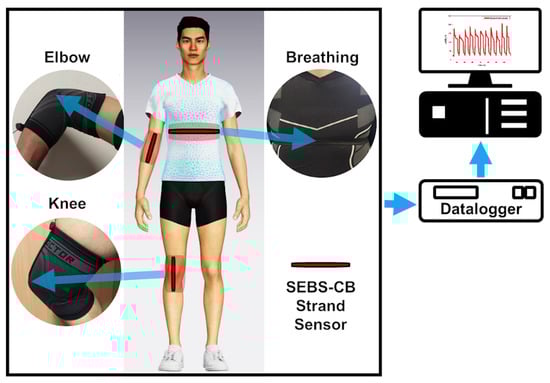 To summarize our aim and motivation, the work in this article is centred on the preparation of a flexible, conductive nanocomposite strand, SEBS/CB. An economical and eco-friendly solvent-processing method that uses a syringe pump extrusion without further heat treatment is the highlight of the nanocomposite preparation method. Additionally, the flexible, conductive nanocomposite fibre was used as a piezoresistive sensor and was integrated into a sports T-shirt and elbow and knee sleeves. This setup successfully monitored three different breathing phases and posture motions, demonstrating the sensor material’s extreme versatility and usefulness.