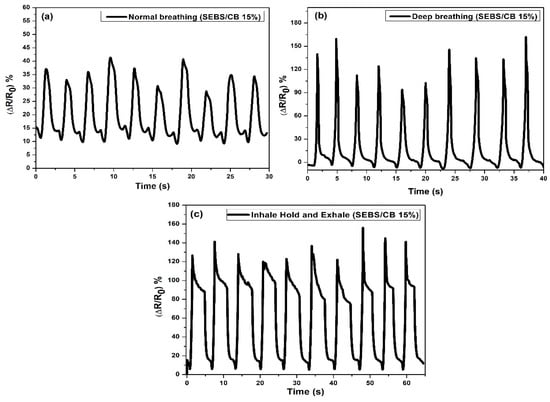 A specific application area for the prepared SEBS/CB polymer strand can be found in the rehabilitation techniques used in rehabilitation exercises. During rehabilitation exercises, it is very important to obtain feedback on the progress of the rehabilitated body parts []. In the form of a strand, a sensor is able to evaluate, for example, the bending of the limbs in the joint. Another advantage is that the weight of the SEBS/CB polymer strands used in the experimental measurements is low and therefore has a minimal effect on the load on muscles and joints. Respiration activities can also be detected during the rehabilitation process. Breathing can also refer to the oxygenation of the blood, which is one of the important indicators for medical doctors []. The breathing rate can also be easily measured. Identifying types of breathing can also refer to the activity performed by patients for deep breathing during heavy physical tests.