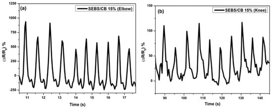 In order to study the usability of the SEBS/CB nanocomposite strand, the SEBS/CB 15% sample was stitched on a sports T-shirt, and three different modes of breathing were monitored: normal breathing, deep breathing and inhale–hold–exhale. The test was conducted on an individual wearing the body-fit tee with the stretchable fibre stitched around the chest of the clothing. The three different modes of breathing were monitored as an electrical resistance response to the sensor. The real-time reading of the sensor was observed and was used for ten cycles. In another instance, the nanocomposite fibre was sewn onto the knee and elbow sleeves. These sleeves were worn by the volunteer on the right elbow and right knee. A brisk walk was conducted to test the piezoresistive response of the SEBS/CB 15% conductive fibre. The idea was to apply the sensing element to the T-shirt, knee sleeves, and elbow sleeves with minor modifications, as shown in Figure 10.
