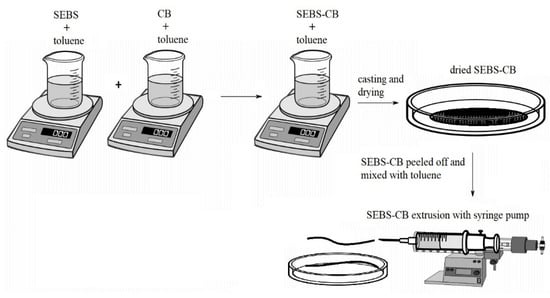 To prepare the 15 wt.% nanocomposite (denoted as SEBS/CB 15%), 1 g of SEBS and 0.15 g of carbon black were added separately to a 25 mL beaker. Toluene was separately added to the beaker containing SEBS and CB. The beaker containing toluene and SEBS was stirred in a magnetic stirrer at 500 rpm for 30 min. In another 25 mL beaker on a magnetic stirrer, CB and toluene were mixed together for two hours. This was followed by the addition of the SEBS solution to the beaker containing CB (about 8 h) to properly mix the composite dispersion. This dispersion was then poured into a Petri dish (15 cm diameter), and the composite was allowed to dry overnight at room temperature. The dried SEBS/CB 15% composite was peeled off with tweezers, mixed with toluene, and loaded into a 6 mL syringe. A New Era NE-1000 one-channel, programmable syringe pump was utilised for the extrusion of the composite. The syringe opening served as the extrusion die. The extrusion velocity was 2.5 mL/h. An illustration of the solution-processing nanocomposite preparation is depicted in Figure 13. The extruded SEBS/CB fibre/strand was dried overnight at room temperature. The diameter of the extruded strand was 1.65 mm on average.