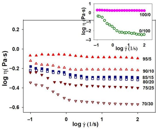 Thus, the flow behavior indices were close to the unit for HPMC and blends that dis not exceed 15 wt.% (e.g., 95/5, 90/10, and 85/15 wt.%/wt.% compositions), highlighting the Newtonian behavior, in accordance with the rheological profiles illustrated in Figure 1. Instead, the flow curve for pure PVP exhibited two distinguished regions, characterized by different slopes (Figure 2, small graph), where the power law index, n, takes values lower than unity (Table 1), revealing a shear thinning (pseudoplastic) behavior.