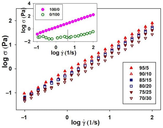 Double-logarithmic plots of shear stress (σ) vs. shear rate () for pure samples HPMC, PVP (small plot), and HPMC/PVP studied systems in different mixing ratios at 25 °C.