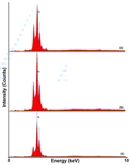 EDX spectra for: HPMC-AgNPs (a), PVP-AgNPs (b), 70 HPMC/30 PVP-AgNPs (c).