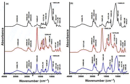 FTIR spectra of free (a) and embedded with AgNPs (b) HPMC (black), PVP (red), 70 HPMC/30 PVP (blue) samples.