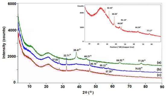The structural features related to the phase composition for the materials based on HPMC with embedded silver were performed using XRD measurements. The identified distinct diffraction peaks according to Figure 6 revealed the crystalline nature of the synthesized particles. Moreover, the obtained experimental results were found to be inconsistent with those reported for the diffraction pattern of AgNP [76]. Additionally, the peaks near to 27.8°, 32.7°, 46.1°, 55.1°, 57.2° may have been due to the presence of a polymeric phase on the surface of particles. Based on the obtained results, the ability of PVP to stabilize the silver nanoparticles more strongly than the cellulosic derivative was confirmed, in accordance with the XRD pattern of ICSD standard No. 98-018-0878.