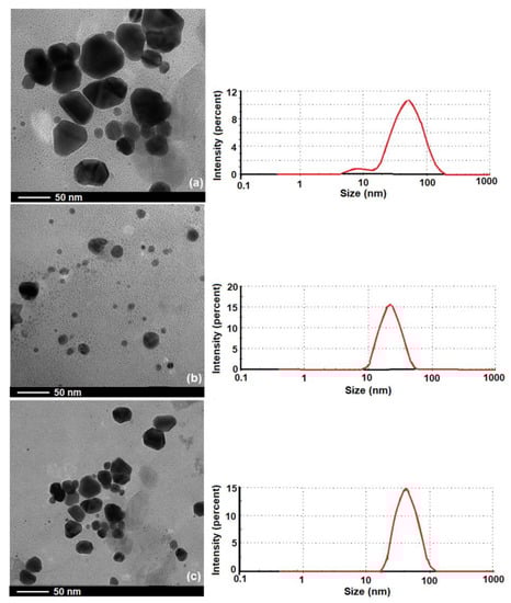 The average particle size distribution of AgNPs was measured with DLS (Z-average) as shown in Figure 7. The obtained results were compared to those obtained from TEM and are listed in Table 2. The observed differences between the obtained parameters can be attributed to the applied methods, namely DLS depends on the hydrodynamic size, while TEM depends on the physical size. Furthermore, the sizes observed by DLS were larger than the results of the TEM images, which was due to the screening of small particles by large ones [76,77]; an aspect which also confirms the polydispersity of AgNPs.