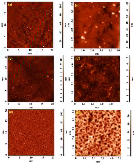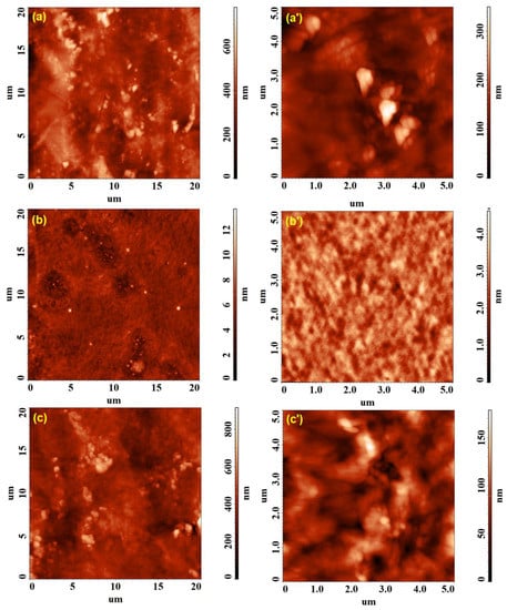 AFM topographical images collected on 20 × 20 µm2 and 5 × 5 µm2 for HPMC-AgNPs (a,a′), PVP-AgNPs (b,b′) and HPMC/PVP-AgNPs (c,c′) samples after incorporating Ag nanoparticles.