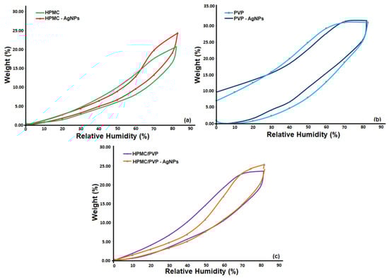 Sorption–desorption isotherms for studied materials: (a) HPMC and HPMC-AgNPs, (b) PVP and PVP-AgNPs, (c) HPMC/PVP and HPMC/PVP-AgNPs.