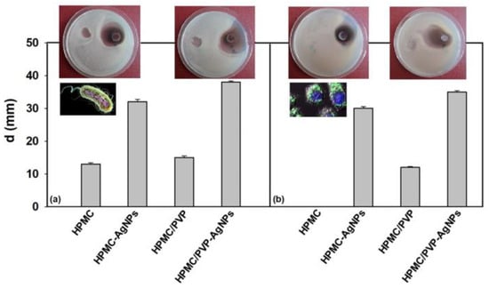 To investigate the impact of the bactericidal properties and distinctive mode of action of AgNps on bioactivity of new formulation/materials based on HPMC, the microbial test was performed. Thus, the studied polymeric materials were examined for their capability of inhibiting the growth of various pathogens using the agar diffusion method. By measuring the diameter of the inhibition zones established after incubating the samples at 37 °C and 24 h, the susceptibility of the tested materials against two bacterial strains Escherichia coli and Staphylococcus aureus was specified (Figure 12).