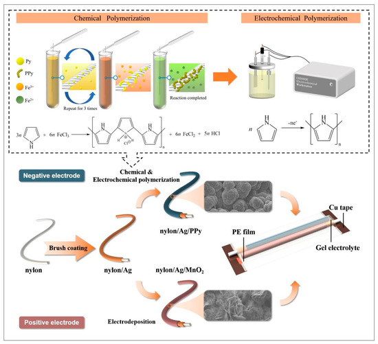 The fabrication processes of the nylon/Ag/MnO2 and nylon/Ag/PPy electrodes are illustrated in Figure 1. The nylon/Ag/MnO2 fiber electrode was fabricated by the electrochemical deposition (ECD) method on the nylon/Ag yarn. Firstly, the commercial nylon yarn (6 cm) was washed by DI water and immersed in ethanol for 15 min. Secondly, after the nylon yarn was naturally air dried, the conductive silver paste was uniformly coated onto the nylon yarn via the brush coating method. The silver-covered yarn was then put into a hot oven (DHG-9011A, from JingHong, Shanghai, China) at 80 °C for 1 h to cure the silver paste. When the yarn was cooled to room temperature, the second step was repeated once more to obtain the nylon/Ag yarn. The total mass of silver slurry coated on the nylon yarn was about 14 mg. After heat curing, the silver paste showed an excellent linear resistance of about 0.8 Ω cm−1. The optical pictures of the nylon/Ag yarn before and after the heat curing are exhibited in Figure S2a. The electrochemical deposition was carried out in a three-electrode electrochemical system (CHI660E electrochemical workstation, Chenhua, Shanghai, China) with the nylon/Ag as the working electrode, a platinum foil as the counter electrode and a saturated calomel electrode (SCE) as the reference electrode. A mixed aqueous solution of Na2SO4 (0.1 M) and Mn(CH3COO)2·4H2O (0.1 M) was used as the electrolyte. A constant potential of 0.8 V was applied to the working electrode for 1800 s. Then, the electrochemically deposited nylon/Ag/MnO2 electrode (600 μm in diameter, 0.94 cm2 effective surface area) was fabricated and flushed by DI water repeatedly and dried at room temperature.