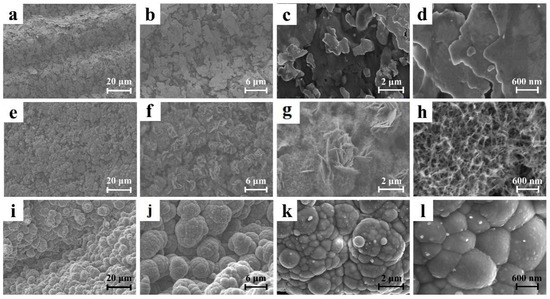 SEM images of (a–d) nylon/Ag; (e–h) nylon/Ag/MnO2 and (i–l) nylon/Ag/PPy electrodes at different magnifications.