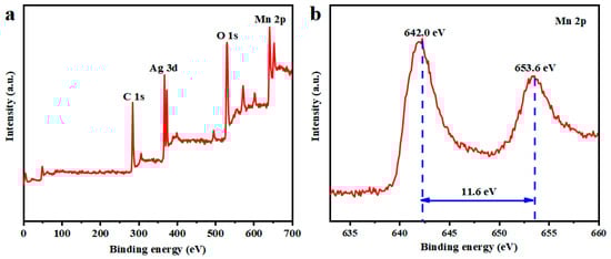 The XPS spectrum of the nylon/Ag/MnO2 electrode is shown in Figure 4. In Figure 4a, the peaks of Ag 3d, O 1s, C 1s and Mn 2p can be observed. Additionally, the peaks of Mn (2p1/2, 2p3/2) are displayed in Figure 4b. The Mn 2p1/2 and 2p3/2 peak values were located at 642.0 eV and 653.6 eV, respectively, with a separated spin energy of 11.6 eV. These results are in accordance with previous reported data of Mn 2p1/2 and 2p3/2 in MnO2 [29,30]. It can be confirmed that MnO2 was successfully electrodeposited on nylon/Ag.