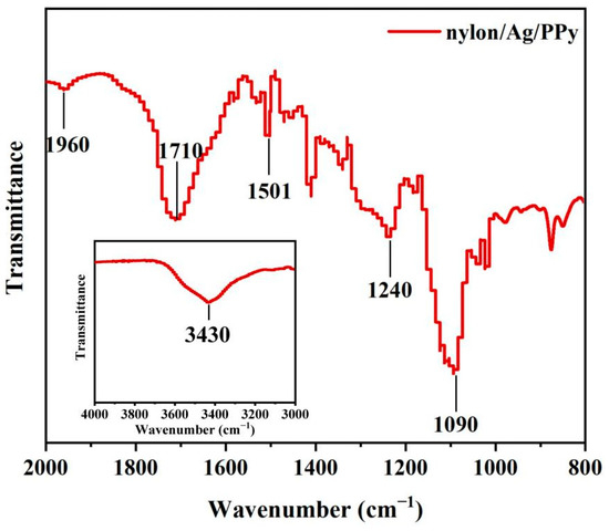 The FT-IR patterns of the nylon/Ag/PPy electrode were shown in Figure 6. The absorption peaks at 1090 cm−1 and 1240 cm−1 are attributed to C-N stretching vibrations of polypyrrole [32]. The characteristic peaks at 1501 and 1710 cm−1 correspond to the PPy ring stretching characteristic bands [33]. The peak at 1960 cm−1 comes from the N-H deformation vibration absorption peak on the polypyrrole ring [32]. Furthermore, the band at 3430 cm−1 describes C-H stretching vibrations [33]. These characteristic peaks confirmed that the PPy was successfully synthesized on the surface of the nylon/Ag yarn.