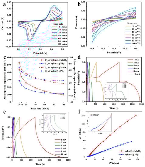(a,b) CV curves of the (a) nylon/Ag/MnO2 and (b) nylon/Ag/PPy electrodes at different scan rates; (c) the CL and CA calculated from CV curves in (a,b) of the two electrodes at different scan rates; (d,e) GCD curves of (d) nylon/Ag/MnO2 and (e) nylon/Ag/PPy electrodes at different charge/discharge currents (the inset shows the GCD curves from 4 mA to 10 mA); (f) EIS of the electrodes (the inset shows the enlarged view of the high-frequency region).