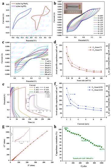 The parameters with the superscripts “+” and “−”correspond to the positive and negative electrodes. Based on the above-shown equation, the CL of nylon/Ag/MnO2 and nylon/Ag/PPy based on the CV curves in Figure 8a was used; the length ratio of the negative and positive electrodes was close to 1:1. Therefore, both a nylon/Ag/MnO2 electrode and a nylon/Ag/PPy electrode with lengths of 5 cm were used to assemble the WASC, whose optical picture is shown in the inset of Figure 8b. The electrochemical performances of the constructed WASC were studied and the results are shown in Figure 8b–h. Figure 8b displays the CV curves of the assembled WASC at 40 mV s−1, while the potential window varied from 0–0.8 V to 0–1.6 V. The CV curves retained a similar shape and no obvious deformation was observed even when the potential reached 1.6 V, implying the good capacitive behavior of the WASC in this broad potential window. With the voltage windows extended from 0.8 to 1.6 V, the calculated CA of the device increased from 37.5 mF cm−2 to 58.0 mF cm−2, and the corresponding energy density of the WASC increased about six-fold from 3.4 μWh cm−2 to 21.1 μWh cm−2.