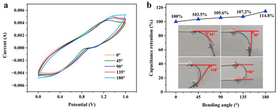 To evaluate the electrochemical stability of the WASC under bending state, the CV characteristic was tested at 40 mV s−1 under different bending angles from 0° to 180°, which is shown in Figure 9a. Two platinum clips were used to adjust the bending angle of the WASC as shown in the inset of Figure 9b. During the CV tests, two clips were connected to the WASC and the positive and negative electrodes of the electrochemical workstation, respectively. It can be seen that the CV curves showed approximately the same shape at different bending angles and the capacitance of the tested WASC varied within 4% as the bending angle increased (Figure 9b), demonstrating the good electrochemical stability of the WASC under the bending state.