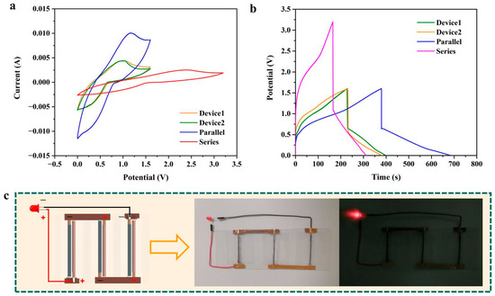 (a) CV curves. (b) GCD curves of two fabricated devices in parallel and series connections; (c) schematic diagram and optical picture of the circuit consisting of three as-fabricated WASCs to illuminate a LED.