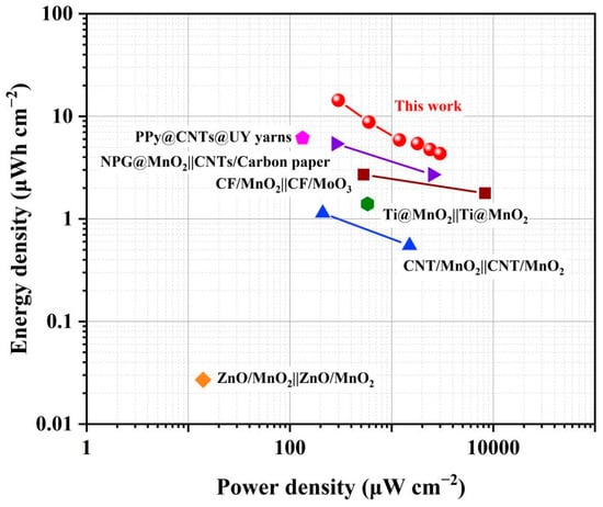 Furthermore, Table 2 provides a brief review of the electrodes, configuration, gel electrolytes, potential windows and specific capacitance (CL and CA) of some similar reported works, which also used MnO2 or PPy as active materials. It can be seen that although the voltage window of WASC in this work is not the highest among them, its CL and CA are higher than those of the flexible supercapacitors in other works. Compared with some identical symmetric pseudocapacitive devices such as CNT/MnO2||CNT/MnO2 [47], the CL and CA of the WASC in this work are clearly higher, and even when compared with asymmetric pseudocapacitive devices (CF/MnO2||CF/MoO3 [43], Cu wire/CuO NWs||CF/PPy [48] and CF/PPy||CNT/MnO2 [49], it still has better capacitive performance, which can be attributed to its excellent pseudocapacitive performance. Figure 11 presents the Ragone plot of the nylon/Ag/MnO2||nylon/Ag/PPy solid-state asymmetric supercapacitor calculated from GCD curves. With the increase in charge/discharge current, the areal energy density of the device varied from 13.9 to 4.2 μWh cm−2, corresponding to the power densities of 290 to 2902 μW cm−2. This performance is better than some previously reported works, such as the fiber/wire shaped supercapacitor of PPy@CNTs@UY yarns (6.13 μWh cm−2 at 133 μW cm−2) [50], NPG@MnO2||CNTs/Carbon paper (5.4–2.7 μWh cm−2 at 284–2531 μW cm−2) [51], CF/MnO2||CF/MoO3 (2.7–1.78 μWh cm−2 at 530–8300 μW cm−2) [43], Ti@MnO2||Ti@MnO2 (1.4 μWh cm−2 at 580 μW cm−2) [52], CNT/MnO2||CNT (1.14–0.55 μWh cm−2 at 210–1500 μW cm−2) [14] and ZnO/MnO2||ZnO/MnO2 (0.027 μWh cm−2 at 14 μW cm−2) [53]. Moreover, the performance of the WASC fabricated is also better than some supercapacitors which are based on compositing conducting polymers with metal nanoparticles and 2D materials, such as the micro-supercapacitor (MSC) based on Cu-OHTP/exfoliated graphene (EG) thin film (14.3 mF cm−2) [54] and MSC based on SA-MXene (108.1 mF cm−2) [55]. This excellent performance can be attributed to the high CA and extended operating voltage window of the asymmetric supercapacitor prepared in this work.