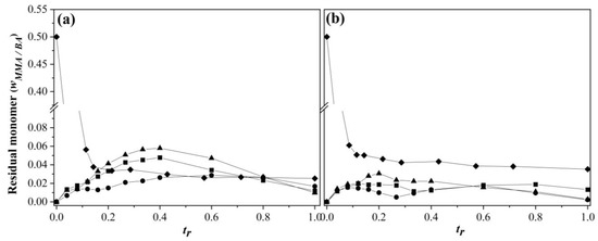 - Lee, C.-F.; Lin, K.-R.; Chiu, W.-Y. Kinetics Studies of Two-stage Soapless Emulsion Polymerization of Butyl Acrylate and Methyl Methacrylate. J. Appl. Polym. Sci. 1994, 51, 1621–1628. [Google Scholar] [CrossRef]