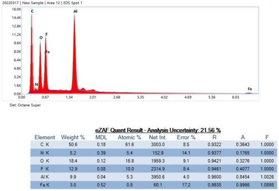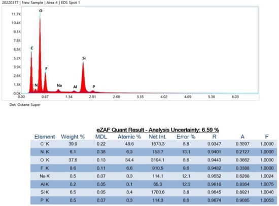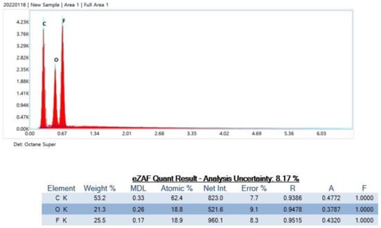 After the impurity particles were detected using SEM, a targeted X-ray beam was used to detect the isotopes of the impurities (Table 2). Product E contained C, O, and F isotopes, and normal filter paper isotopes (Figure 8).