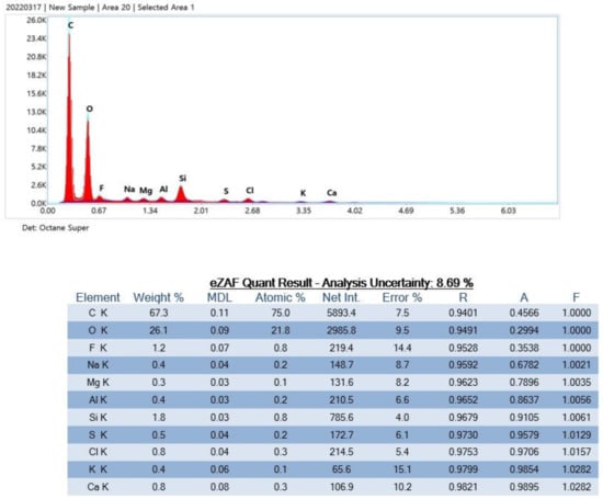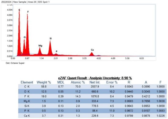 Product F contained Si, Al, Mg, and Ca isotopes (Figure 12). As the number of particles in the control particle analysis was too low, EDS analysis could not be performed.