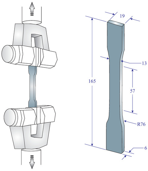 A series of tensile tests was conducted on the dumbbell-shaped samples. To this aim, we used SANTAM STM-150 uniaxial testing machine with a cross-head speed in the range of 0.001 mm/min to 500 mm/min equipped with a 50 kN load cell. The wedge grips of the machine directly gripped the shoulder parts of the specimens which were subjected to uniaxial tensile load. Appropriate tensile grips were used to keep the test coupons completely aligned in the vertical direction. In this study, the specimens experienced the constant crosshead speed of 5 mm/min until final failure. Geometries of a dumbbell-shaped specimen and tensile test conditions are schematically illustrated in Figure 2. In the present study, four identical dumbbell-shaped specimens were examined to ensure repeatability and reproducibility of the results.