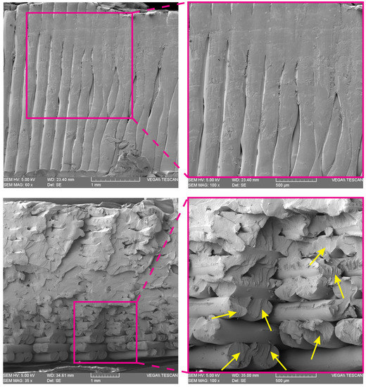 In Figure 10 the SEM images of two reference points (2 and 3) of a tested 3D-printed ABS specimen are illustrated. This specimen has the hole diameter of 12 mm () and shows net-tension and cleavage failure modes. In Figure 10 (top), there is a compression in the filaments due to the bearing load. The ridge marking pattern (yellow arrows) shown in Figure 10 (bottom) indicates that the rasters located at the top of the hole (point 3) tolerate a large portion of applied load where the inter-raster and inter-layer bonding strength bear a small portion of the applied stresses.
