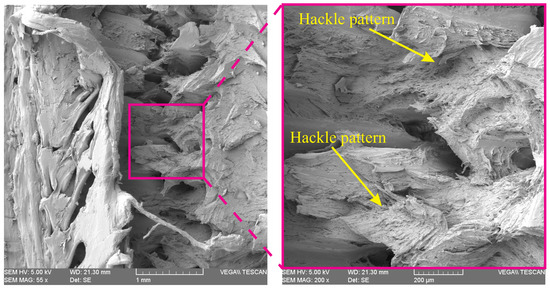 Figure 11 demonstrates the fracture surface of point 1 of a 3D-printed PLA specimen with the hole diameter of 3 mm where the net-tension failure occurred. The hackle pattern shown in this figure implies the high energy dissipation resulting in large plastic deformation [33]. This issue is in accordance with the load-displacement curves shown in Figure 8 (left).