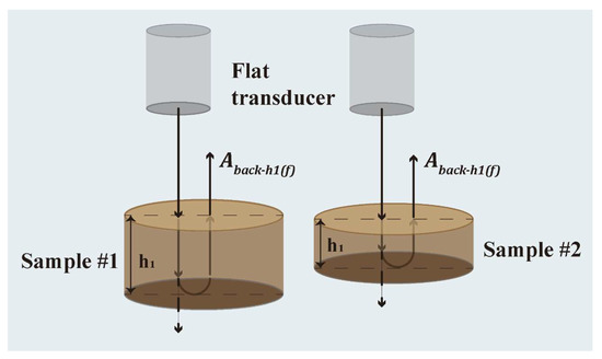 The velocity and attenuation of elastic waves were measured using a pulse-echo experiment with a planar immersion transducer, as shown in Figure 1. During the experiment, a single transducer was used to transmit and receive elastic waves that propagated through the water and solid samples. Samples 1 and 2 with thicknesses h1 and h2, respectively, were prepared for the test. Echo signals were obtained under identical test conditions to eliminate the effect of the medium and interface on the elastic wave. The strength of the received elastic wave (, ) was calculated from the time-domain signal received by the oscilloscope using Fast Fourier Transform (FFT). The experiment was repeated five times for each sample to ensure repeatability.