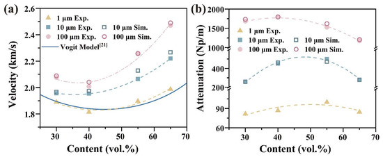 Figure 4 depicts the similarities between the simulation and experimental results for the elastic wave propagation behavior in the Cu/PMMA composites, which verifies the precision of both methods. Nonetheless, in some instances, the samples may not be entirely compact, leading to a slight difference between the simulation and experimental attenuation values. The elastic wave velocity and attenuation exhibit an inflection phenomenon for volume fractions of Cu particles ranging from 30 to 65%. This phenomenon has also been observed in PS/EPDM blends [31] and TiO2/PDMS [32]. The findings indicate that as the particle size of Cu powder increases, there was a growth in the wave velocity, in addition to an increase in the order of magnitude surge in the wave attenuation coefficient. For example, the wave velocity ranges from 1.89 km/s to 2.01 km/s in Cu/PMMA composites containing 30 vol. % of particles, and the wave attenuation coefficient ranges from 81.6 Np/m to 1678.8 Np/m as the particle size increases from 1 μm to 100 μm. With an increase in the particle size, the inflection point of the wave velocity and attenuation moves in the direction of the lower content.