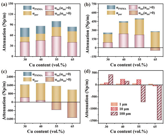 The total attenuation of the elastic waves in the Cu/PMMA composites was decomposed into three parts, as shown in Figure 7. As the particle size increased, the proportion of in the total attenuation decreased, with the () becoming the primary component of the total attenuation. Liu [41] also observed that scattering became the dominant mechanism of energy attenuation when the particle size was comparable to the elastic wavelength. In addition, changed as the particle size varied. At a particle size of 1 μm, initially increased, then decreased, and finally remained positive. At a particle size of 10 μm, initially increased and then decreased, and the particle interaction became negative at 65 vol. %. At a particle size of 100 μm, was positive with 30 and 40 vol. % contents, but negative with 55 and 65 vol. % contents. increases linearly with the increase in Cu content, yet it always constitutes only a minor portion of the total attenuation. increases with both the Cu content and particle size. initially increased and then decreased as the Cu content increased, leading to an inflection point in the total attenuation.