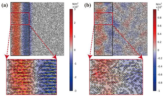 Stress distribution of elastic wave propagating behavior in Cu/PMMA composites: (a) At 0.4 μs; (b) At 1.2 μs.