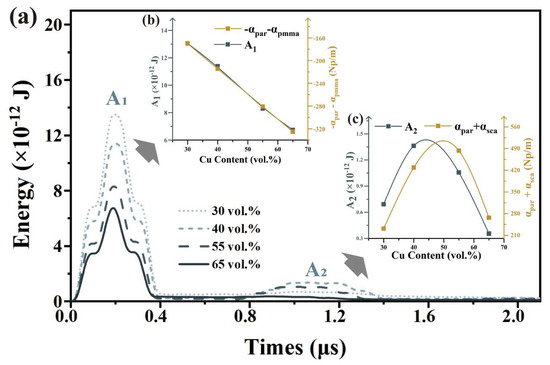 Analysis of mechanical energy after wave of 10 μm Cu/PMMA: (a) Mechanical energy intensity; (b) Height of the first peak(A1) and ; and (c) Height of the second peak(A2) and ().