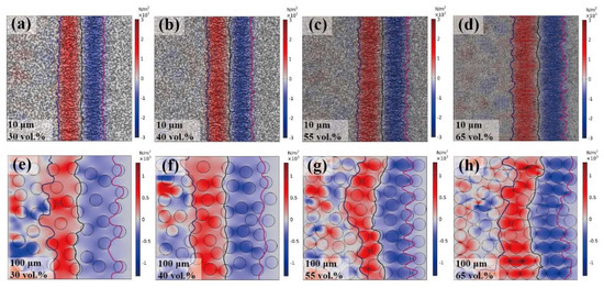 Stress distribution of elastic wave propagating behavior in Cu/PMMA composites: (a–d) particle size of 10 μm; (e–h) particle size of 100 μm.