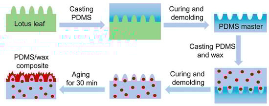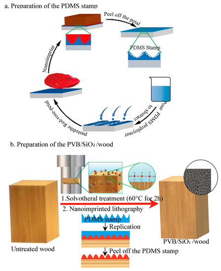 Similarly, it was reported that a petal-like PVB/SiO2 superhydrophobic wood was successfully fabricated by using red rose petals, using rose petals as the base material, and cross-linked PDMS was used as the master template and stamp for nanoimprinted lithography in Figure 2 [18]. Then, the polyvinyl butyral (PVB) mixture solution was evenly coated on the wood surface, and the rough structure on the PDMS master was successfully printed onto the wood surface using the secondary replication method, and finally the superhydrophobic wood with the same structure as the rose petal was obtained. The as-prepared PVB/SiO2/wood surface not only had robust superhydrophobic performance during the ultrasonic rinse and sand abrasion tests, but also stable super-repellency towards commonly used liquids, including brine, tea, milk, and vinegar, and improved the dimensional stability, which can satisfy our daily life application needs. By the same token, PDMS stamps created the hierarchical structures similar with taro leaf surface when the stamps were replicated from fresh taro leaves by soft lithography [19]. Fe3O4 nanoparticles were mixed into PDMS suspensions to obtain Fe3O4/PDMS suspensions, after being dried and PDMS stamps were peeled off, biomimetic wood surface with superhydrophobic and superparamagnetic was created. It is a feasible method for constructing naturally biomorphic structures on wood surfaces with tailored functions. The researchers studied that a new superhydrophobic bamboo timber could promote the applications of superhydrophobic and conductive bamboo products [20]. Superhydrophobic bamboo timber was fabricated by magnetron sputtering and nanoimprinting techniques. Conductive copper films were deposited on the bamboo surface, and then the lotus leaf structure pattern was transferred to the copper bamboo surface. The prepared surface with the lotus leaf structure showed superhydrophobic properties with a water contact angle of 152° and a sliding angle of only 5°. The mechanical stability of the prepared superhydrophobic bamboo was assessed qualitatively by sand abrasion tests. An amount of 20 g of sand grains with diameters ranging from 100 to 300 μm was impacted onto the surface from a height of 30 cm. The surface retained its superhydrophobicity after 100 tests. The coating exhibited good mechanical resistance, environmental stability, and high electrical conductivity.