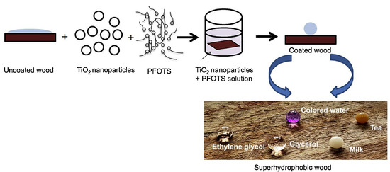 The TiO2 nanoparticles were added to the perfluorooctyltriethoxysilane (PFOTS) solution, hydroxyl group present on TiO2 nanoparticle reacts with the hydrophilic head (-Si(OC2H5)3) of PFOTS molecule which functionalizes the TiO2 nanoparticles [27], formed a uniform self-assembled coating on the wood surface, and the product adheres to the wood surface, leading to the hydrophobic end (C8H4F13) upward, giving the wood surface superhydrophobic properties in Figure 3. During the sol–gel process, nanoparticles are deposited on the wood surface, which often leads to poor coating stability and weak interfacial bonding ability. In order to improve the bonding strength between the sol–gel solution and the substrate material, enhance the interfacial bonding, and prepare materials with mechanical robustness and non-wetting properties. So, the researchers employed Ti–Si sol to build the rough microstructure and polydimethylsiloxane (PDMS) as low surface energy to cooperative fabricate the superhydrophobic wood [28]. Because of the formation of Si–O–Ti, Si–O–Si, and Ti–O bonds through -OH and polycondensation between hydroxyl groups, the cross-linked network of SiO2 and TiO2 was constructed. Further, the PDMS polymer chains were covalently attached to the Si–Ti cross-linked network by graft polymerization of KH-132, forming a low surface energy structure to fabricate a Ti–Si@PDMS superhydrophobic modification system. Enhanced interfacial bonding is due to the presence of covalent bonds. After surface carbonization treatment, the successful transfer of Ti–Si@PDMS from inside the wood by the thermally induced response achieved superhydrophobic self-healing.