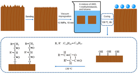 To improve the hydrophobicity of hardwoods, according to the research of Cao et al. [32], the sapwood of birch, oak, and black walnut, was modified with grafted alkylenone dimer (AKD), as shown in Figure 4. After AKD modification, the hydroxyl group reacts with AKD to form a hydrophobic layer. The reaction forms β-ketoester bonds that reduce the free energy of the wood surface. AKD-modified wood exhibits a high degree of hydrophobicity, as well as excellent resistance to water, acids, and toluene, and self-cleaning effects. Yang et al. [33] constructed micro/nanostructures using PDA and alumina nanoparticles (Al2O3). The superhydrophobic wood was prepared through grafting low surface energy to the wood surface modified by octadecyltrimethoxychlorosilane The superhydrophobic wood surfaces exhibited excellent resistance to flow scouring, acid and alkali corrosion, and organic solvents, providing excellent stability in the face of environmental challenges. Based on conventional grafting methods, atomic transfer radical polymerization (ARGET ATRP) is a low-cost reactive polymerization with surface initiating activator (ARGET ATRP) regenerated by electron transfer to efficiently generate homogeneous and dense polymers [34]. This approach improves the stability of superhydrophobic surfaces and has good industrial prospects. In a study [35], ash wood was modified by regenerating surface initiating activators through electron transfer atom radical polymerization at low catalyst concentrations using elemental silver as a medium. The hydrophobic and antimicrobial properties of the wood were obtained by functionalizing ash wood with poly(methyl methacrylate) (PMMA) and poly(2-(dimethylamino)ethyl methacrylate) (PDMAEMA). This study improves the wood properties from an eco-economic point of view and offers great opportunities for its use in industry and in furniture production.
